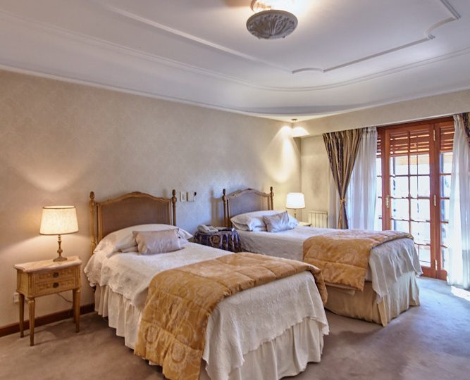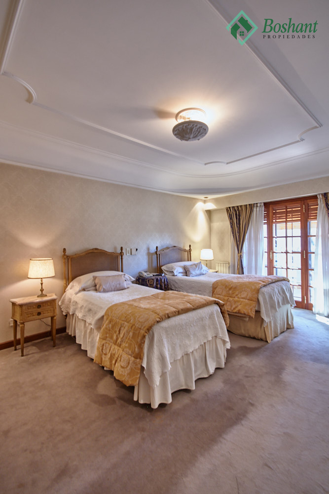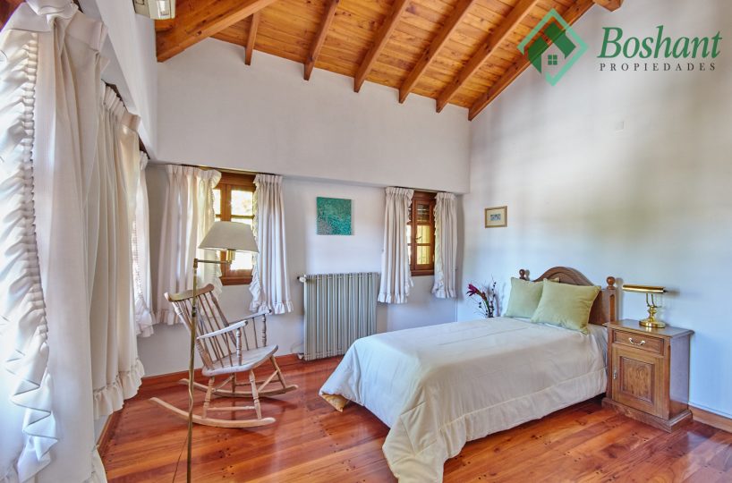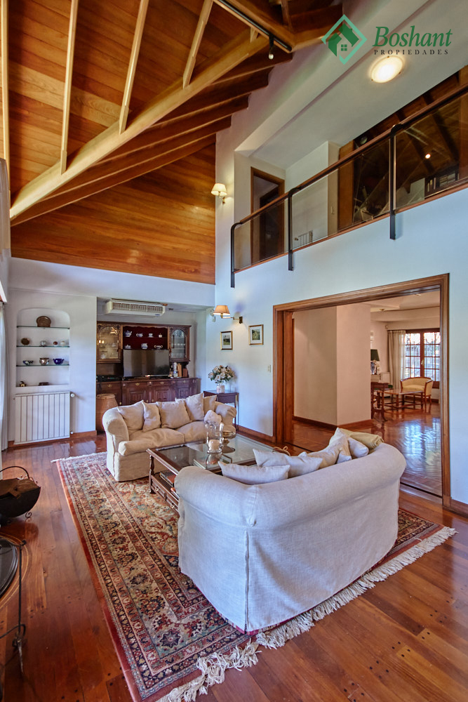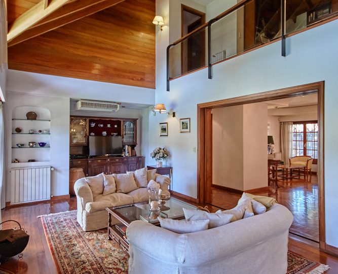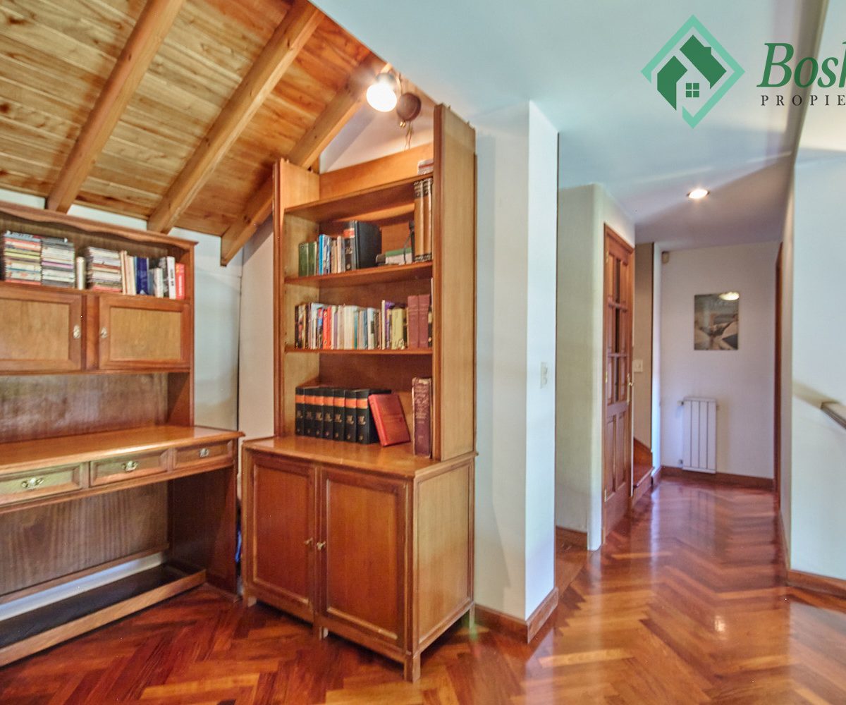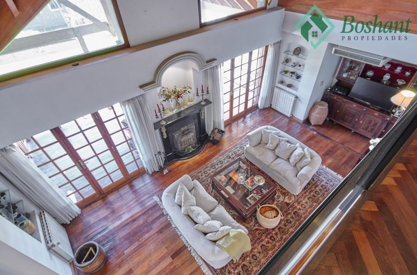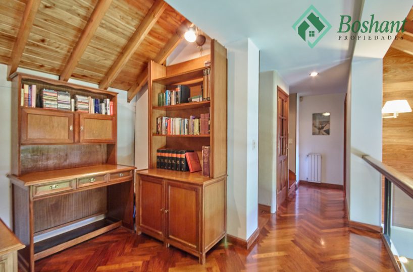 Pasillo abalconado: Un pasillo comunica los dos dormitorios en-suite, uno en cada ala, siendo este un balcón hacia el living con chimenea. Este pasillo también cuenta con un pequeño ambiente abierto donde se ha colocado un escritorio y bibliotecas, y por medio de una puerta semi escondida se accede a un altillo que se usa de baulera.