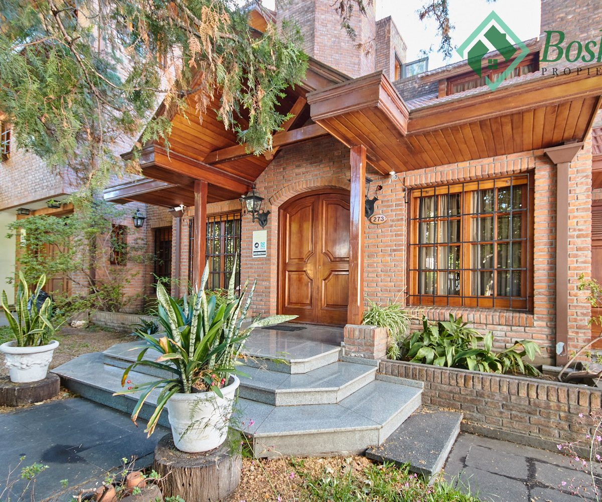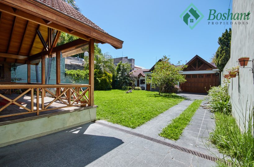 Dos entradas de garaje: una a cada lado de la casa. Un garaje es pasante al fondo, sale al jardín y un sendero sigue hacia el fondo, con garage/quincho en edificación independiente.