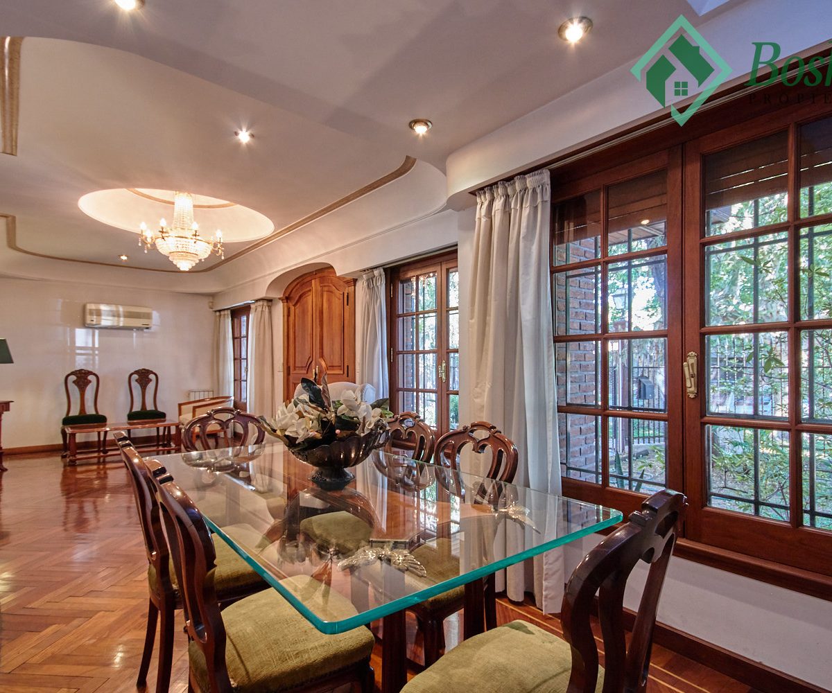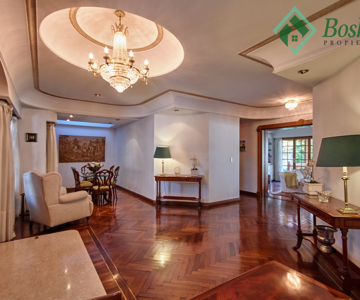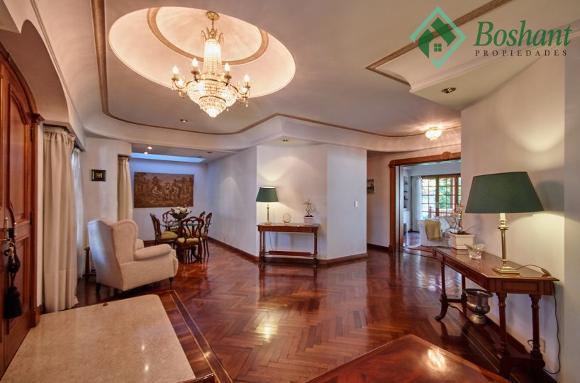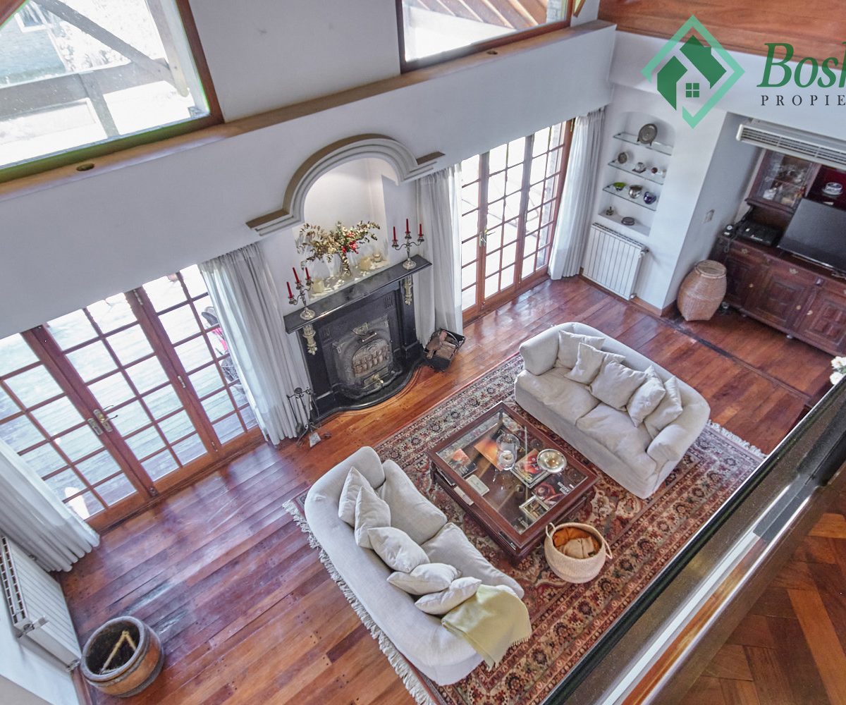 Living Íntimo de aprox. 7 x 3.70 metros, separado de living de recepción por puertas corredizas de madera con vidrio repartido. Chimenea funcionando entre dos amplios ventanales con salida a un deck.