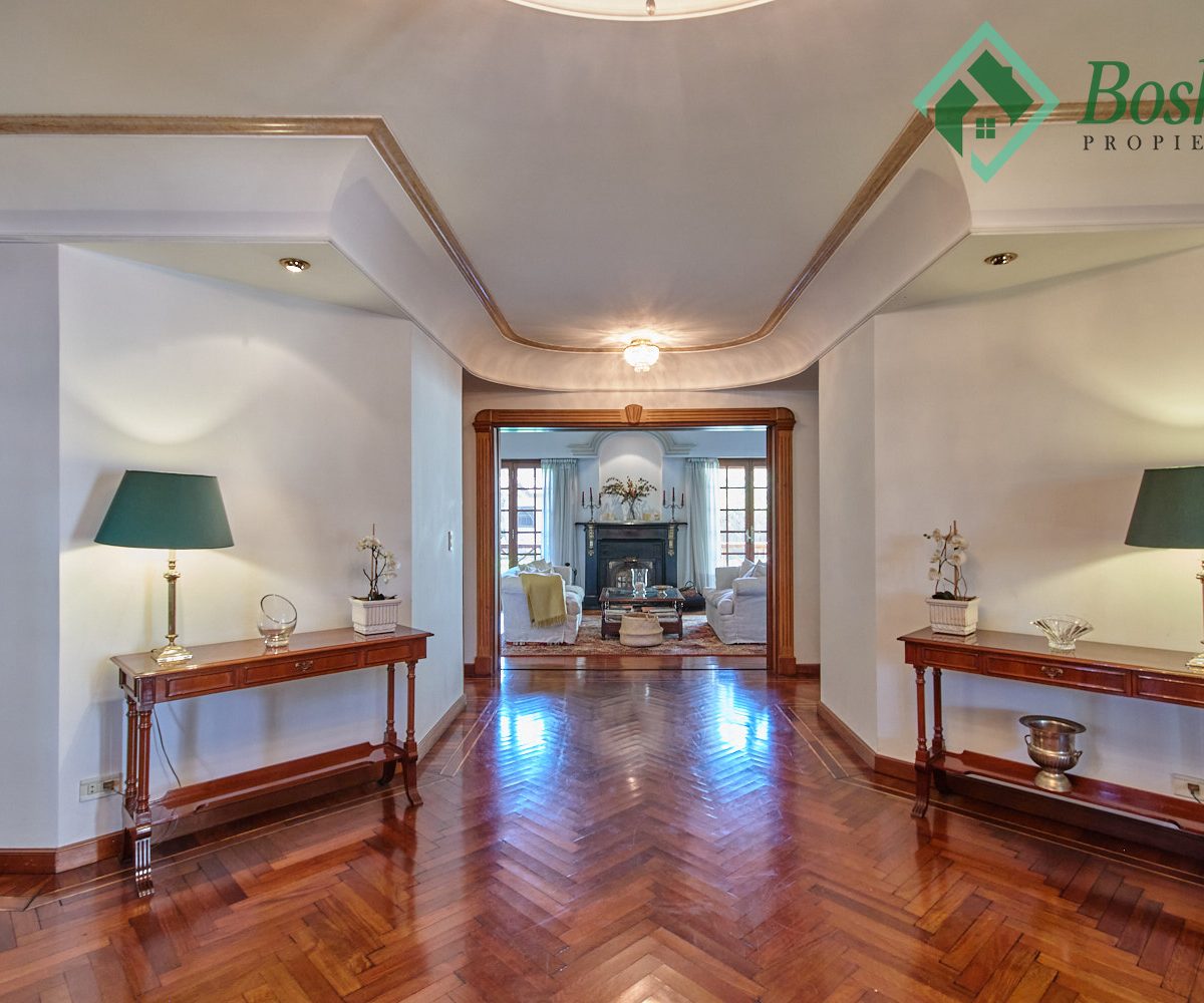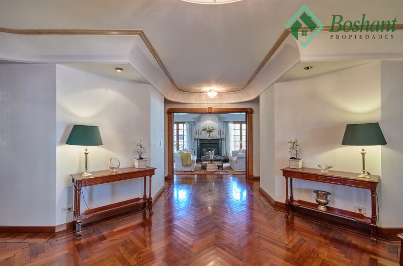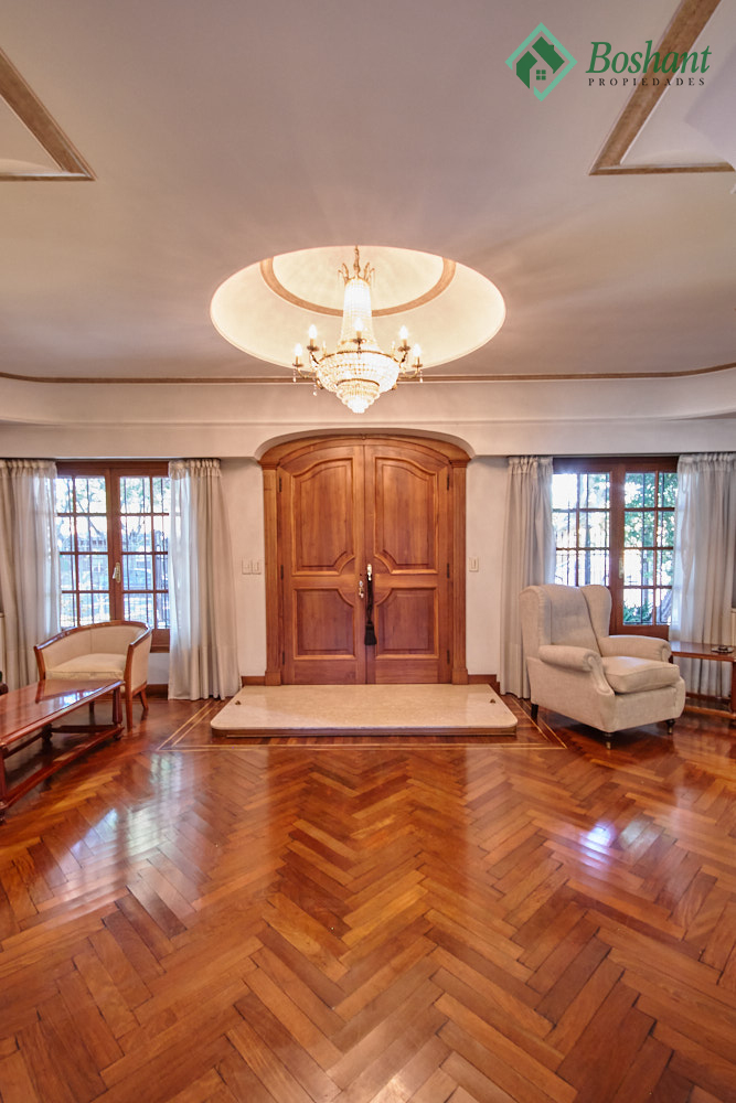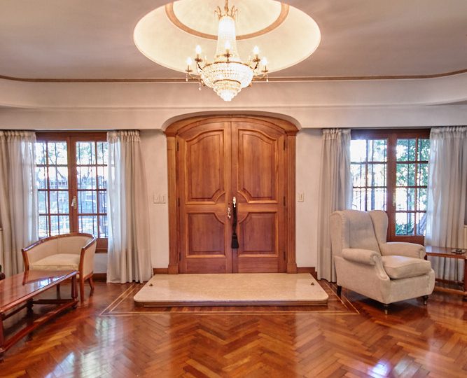Se ingresa por puerta doble de 1.5 metros de madera maciza a un gran salón de recepción. Marmol Botticino de recepción. Cúpula para araña de luces. Techo abovedado en yeso y pintura artística.